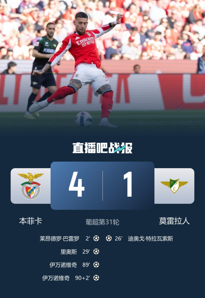 直播吧4月26日讯北京时辰4月26日01:00,葡超第31轮本菲卡迎战莫雷拉东说念主的比赛在光明球场进行,上半场巴雷罗推射闪击笔直,特拉瓦索斯单刀扳平比分,里奥斯抽射破门,下半场谢尔德鲁普头球中楣,伊万诺维奇替补双响,最终本菲卡4-1莫雷拉东说念主赢得三连胜先赛距榜首4分。