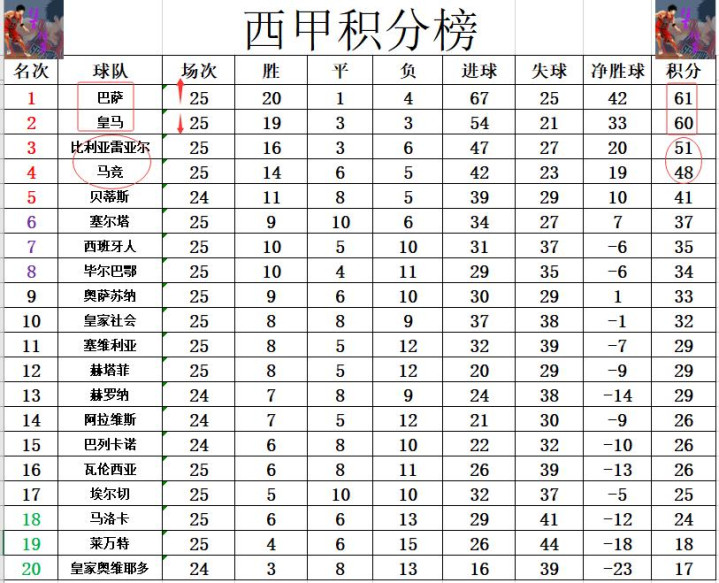 积分榜方面,巴萨今天大捷止住过错后,皇马就确凿只在榜首欢快了一周,惨遭榜首一轮游,巴萨1分的上风向上皇马夺回榜首。比利亚雷亚尔今天赢球,多马竞3分,稳住第3的位置。
