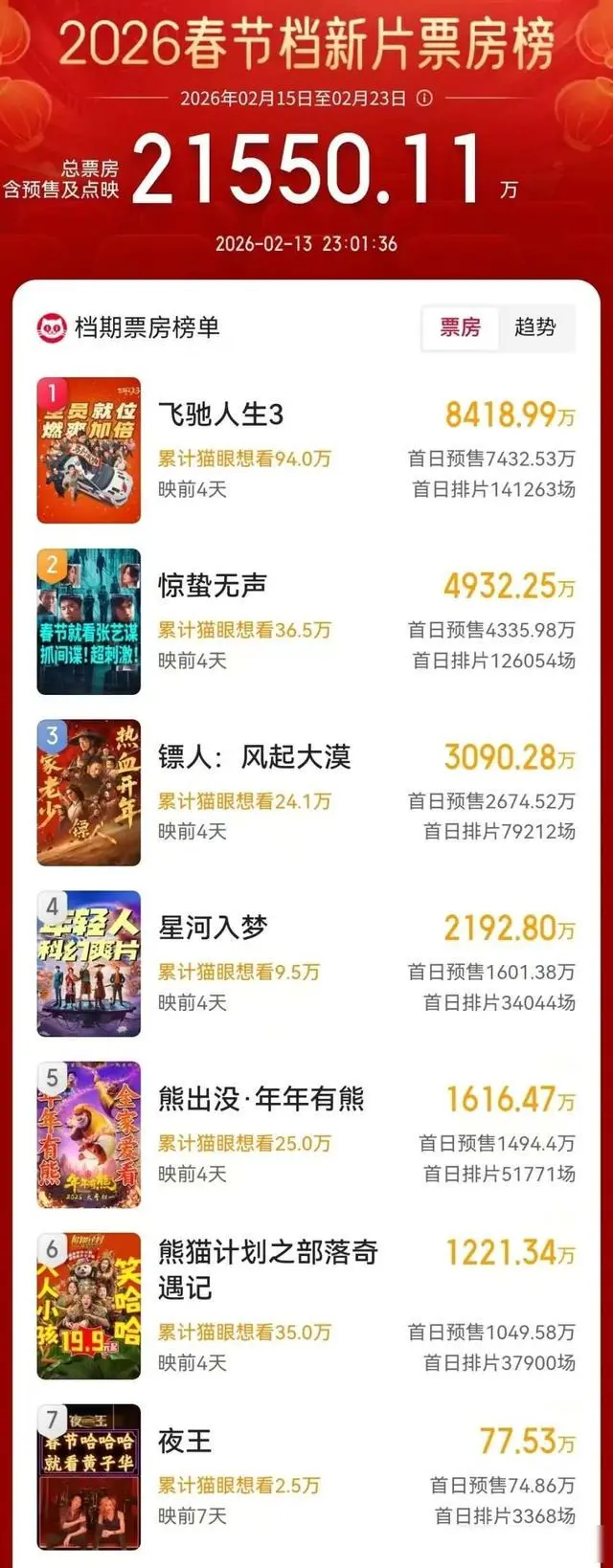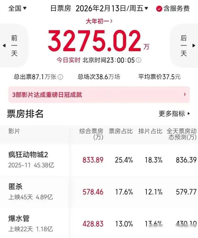 春节前上映的新片,基本王人没能火起来,情东谈主节那天推出的《可爱上“欠欠”的你》《爱乐之城》《缓助汪星东谈主》,排片一启动就被压得很紧,春节档预售诚然破了2亿,显得挺吵杂,但《疾驰东谈主生3》《镖东谈主》《惊蛰无声》这几部电影谁也没占到昭着优势,院线司理应今有点为难,新片撑不起所在,惟有持续给《纵容动物城2》加多场次,有东谈主致使臆想它可能会一直放映到春节档,归正莫得其他影片能顶替它的位置,第六名的《流浪地球》能不可稳住,竟然要看春节那几部片子的施展怎么了。