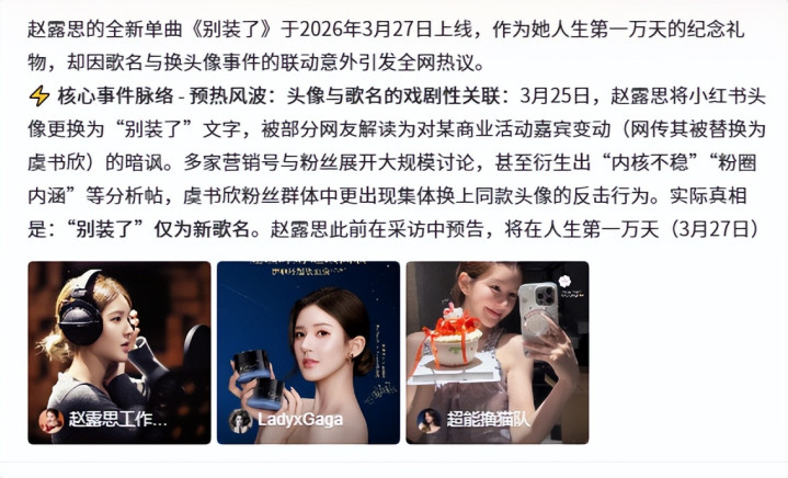 老高我拿着放大镜,在赵露想的新歌挑剔区蹲了一整天,好家伙,这哪是听歌现场,分明是一场大型“对号入座”活动艺术展。3月28日零点一过,那首《别装了》径直炸翻了热搜,再加上之前直播里那句“不可笑就露宿街头”的狠话,我们这位甜妹,这回是真把“别装了”三个字唱成了内娱年度最强回旋镖。