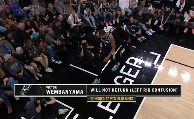 北京技术4月7日,NBA惯例跑马刺主场大战76东说念主,文班亚随即半场出战15分39秒,11中7,三分3中1,罚球4中2砍下17分5篮板1助攻3盖帽,正负值+7,两次受伤离场,因左肋骨毁伤提前退出比赛。