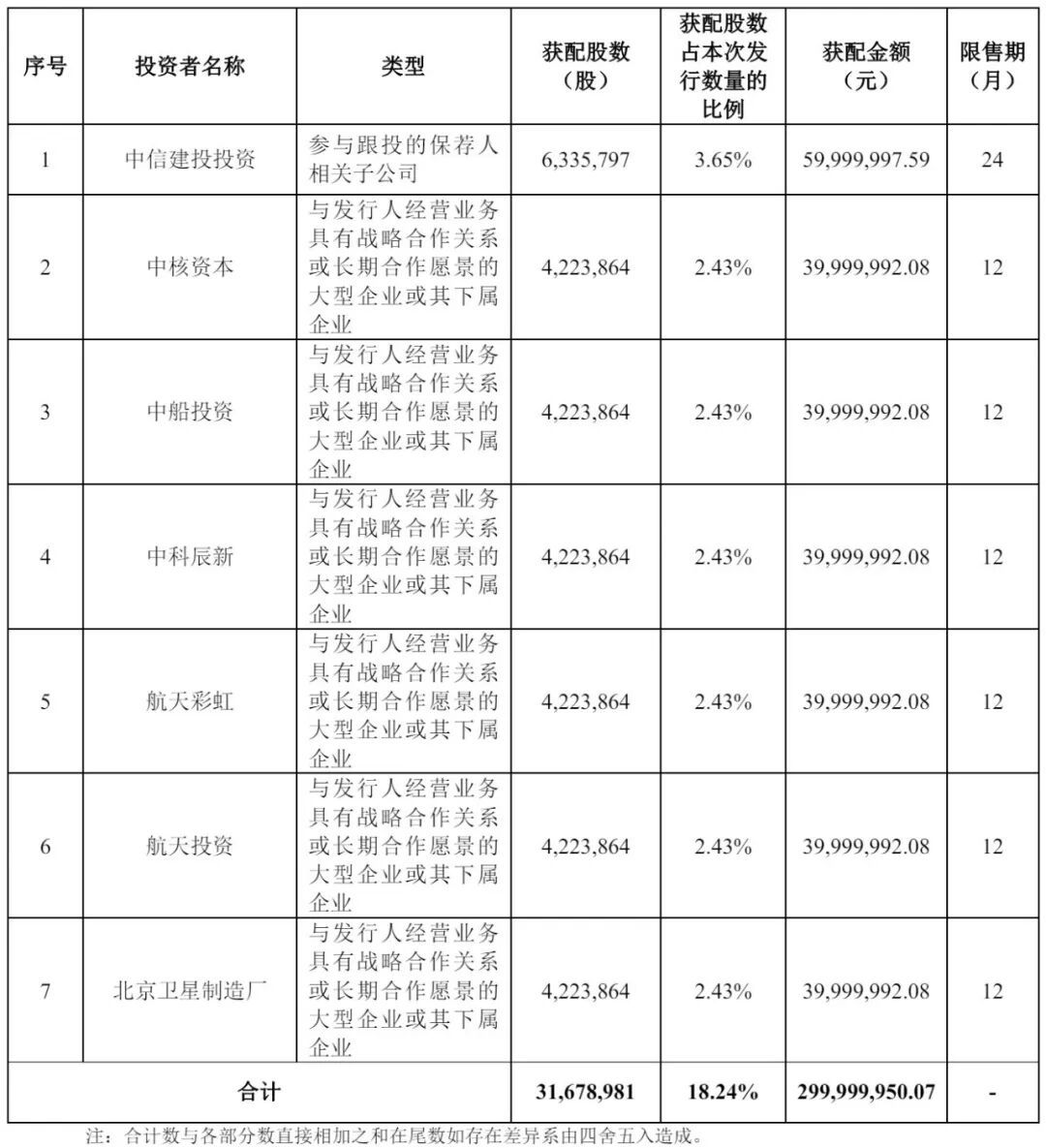 其中,中信建投投资认购6000万元,中核成本、中船投资、中科辰新、航天彩虹、航天投资、北京卫星制造厂离别认购4000万元。