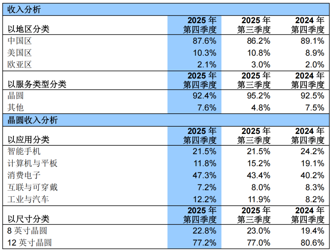 中芯海外第四季度按应用分类,收入占比永诀为:智高手机21.5%、筹画机与平板11.8%、破费电子47.3%、互联与可一稔7.2%、工业与汽车占比合手续进步至12.2%。纵不雅各地区的营收孝顺占比,来自中国区的营收占比进步至87.6%;好意思国区的占比为10.3%,欧亚区占比为2.1%。
