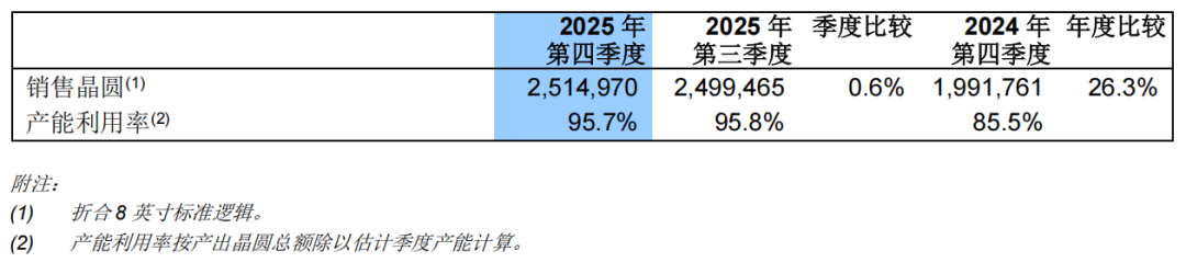 按晶圆尺寸分类,第四季度12英寸晶圆营收占比为77.2%,8英寸晶圆营收占比为22.8%。从产能方面来看,中芯海外月产能由2025年第三季度的102.275万片折合8英寸阵势逻辑加多至2025年第四季度的105.875万片折合8英寸阵势逻辑。第四季度销售晶圆达251.4万片折合8英寸阵势逻辑,产能欺骗率与Q3基本合手平为95.7%。