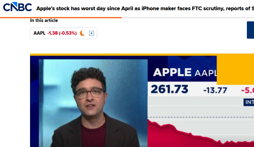 【全国网科技详细报说念】2月13日,据外媒CNBC报说念,苹果公司股价当地时辰周四遇到重创,单日着落5%,收盘价跌至261.73好意思元,创下自旧年4月以来的最差单日阐述,不仅抹去了全年扫数涨幅,还使得其2026年累计跌幅接近4%,当日成交额达215.38亿好意思元,总市值降至3.84万亿好意思元。外媒以为,这次股价大跌,源于Siri蔓延外传、好意思国联邦生意委员会(FTC)监管审查,以及华尔街对大型科技公司AI参预的多半担忧。
