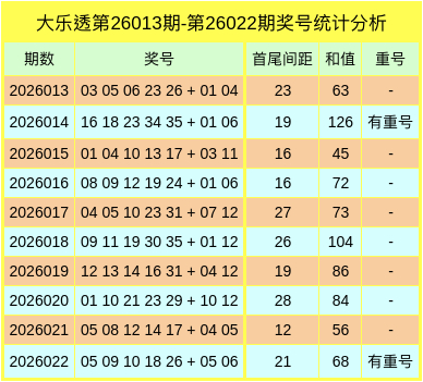 首尾间距大中小:上期前区奖号的首尾间距为21,是大数;本期分析首尾间距开出大数:26;